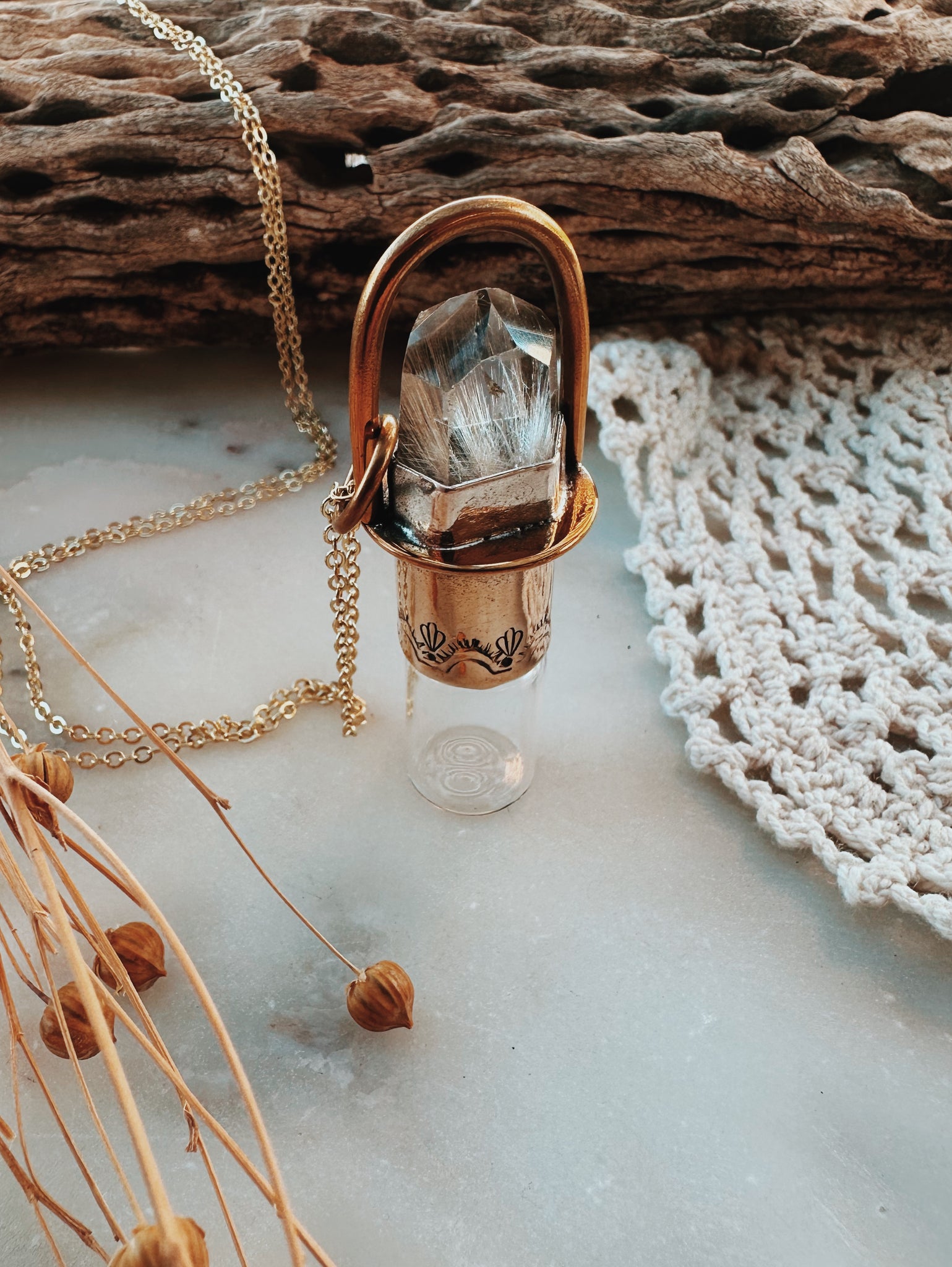 Vial can be unscrewed and filled with essential oils, perfume, or any special memento.